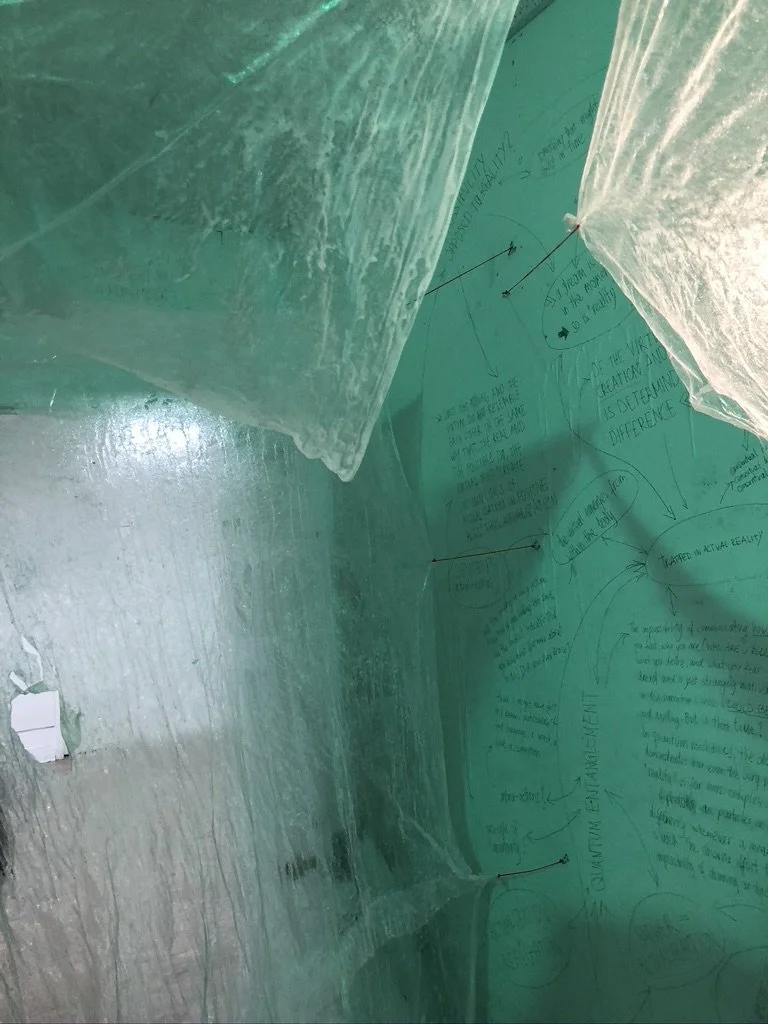 I began working with Kathi on this installation during its infant stages. She had a loose concept and a room with walls covered in a free-associative thought diagram about perception and the internet/technology. We discussed her ideas and decided that the sound component of the installation should focus on unearthing typically imperceptible sonic phenomena in personal spaces and devices. Inspired by the work of Toshiya Tsunoda, I placed contact mics on the window and door of my bedroom to reveal the low-frequency vibrations that my room “hears” at all times. I took these long recordings and edited them into two looping sections. I then used an elecromagnetic field microphone to hear the sounds contained within my laptop and smartphone. I found interesting activity on each device and mapped out spaces appealing sounds happened. Improvisations were recorded over the two sections using this setup. One loop features the electromagnetic field of the laptop, the other the smartphone. Kathi listened to these recordings while continuing to flesh out the visual aspects of the work–she also added a loop of her own voice paired with a video. I mixed the two sections for quadrophonic diffusion, carefully placed the speakers in the space, then let the loops run asynchronously, creating a new sonic environment.